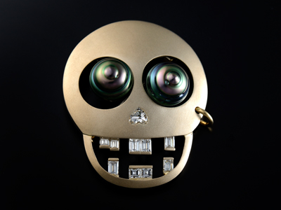 ガイコツブローチ sold out 大きさ:本体天地 約4cm 品番:MTK17 素材:K18(ホワイトゴールド) 詳細:ダイヤモンド1.473 黒真珠 |